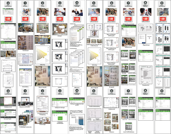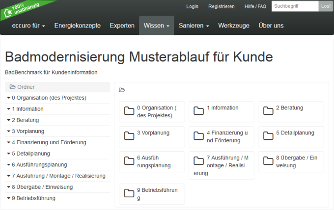 In den letzten Jahren, wurde auf wissenschaftlicher Basis, in mehreren Forschungsprojekten des Bundesministerium für Wirtschaft und Energie, an welchen eccuro maßgeblich beteiligt war, ein systematischer Ablauf für Baudienstleistungen entwickelt. Die Erkenntnisse aus diesen Projekten sind über eccuro in die Praxis eingeflossen und wurden zu einem System weiterentwickelt, welches Herstellern und Handel die Möglichkeit bietet, ihre bisherigen vorhanden Dokumente in einem realen Projekt-Ablauf an der richtigen Stelle einzuordnen. Nehmen wir das Beispiel "Komplettbad-Manager 4.0" - hier wurden alle ermittelten Dokumente und Managementtools entwickelt und strukturiert. Der Hersteller und der Handel bucht bei eccuro diese Umsetzunghilfe - je nach Umfang der Prozesse und der benötigten Hilfe für 9500€. Sobald der erste Prozessablauf gemeinsam erarbeitet wurde, sind Hersteller und Handel in der Regel selbstständig in der Lage auch weitere Prozesse nach seinen Geschäftsfelder betreffend zu erarbeiten oder zu erweitern.