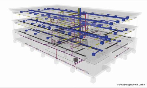 DDS-CAD SHKL für die Sanitär-, Heizungs-, Klima- und Lüftungstechnik ermöglicht die komplette TGA-Konstruktion und Dimensionierung des Rohr- und Kanalnetzes in 2D und 3D – auch gemäß BIM.